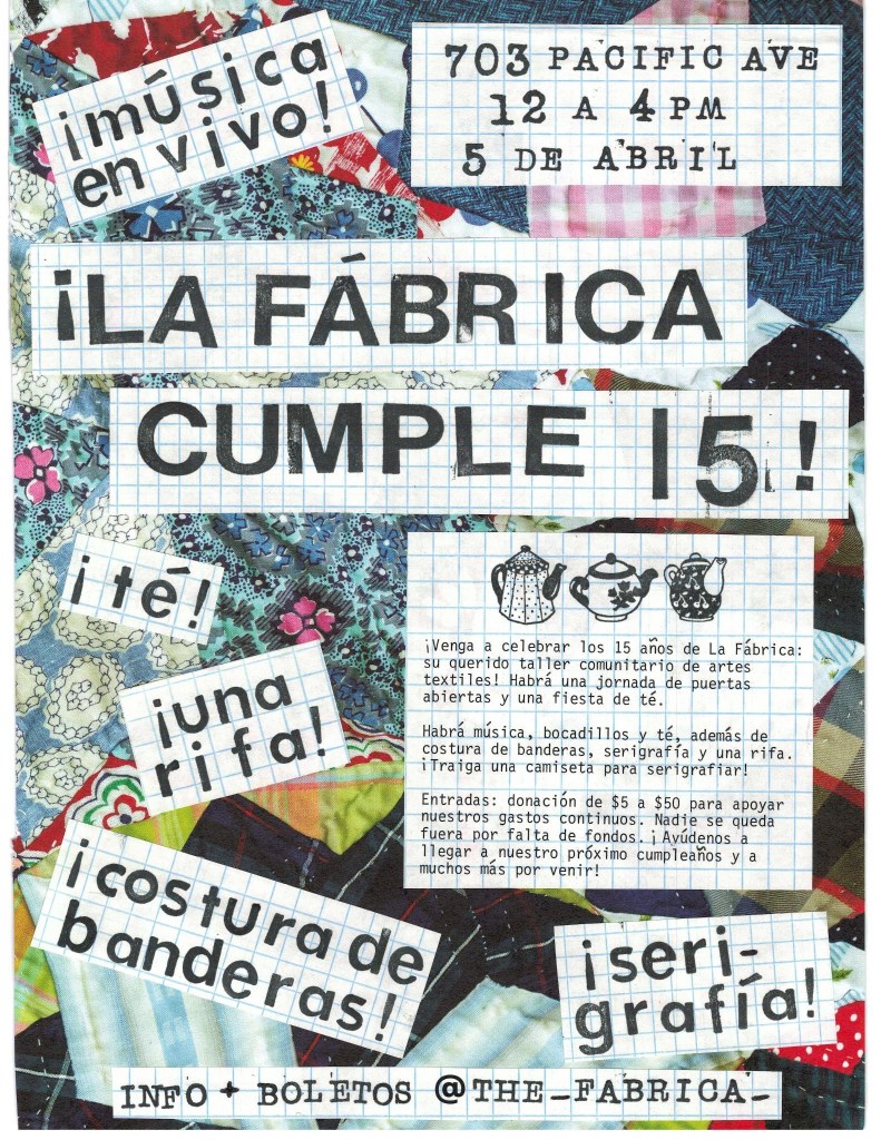 La Fábrica cumple 15 años este abril! Venga a celebrar con nosotros. Habrá una fiesta de té en el jardín. Sábado 5 de abril, 12 a 4 de la tarde Habrá comida, bebidas, música, serigrafía, costura de banderas, y una rifa. Trae una camiseta para serigrafía. Compre boletos con el enlace en nuestra bio, o a la Fábrica en el día del evento. Paga lo que pueda $5-$50. Cada boleto incluye un tíquet para la rifa.