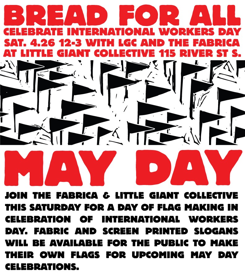 Join LGC and The Fábrica for our annual flag-making event in preparation for May Day! Participants can help prepare fabric and make silkscreen prints. Take some banners with you to decorate your home or wave at a May Day march for International Workers’Day!