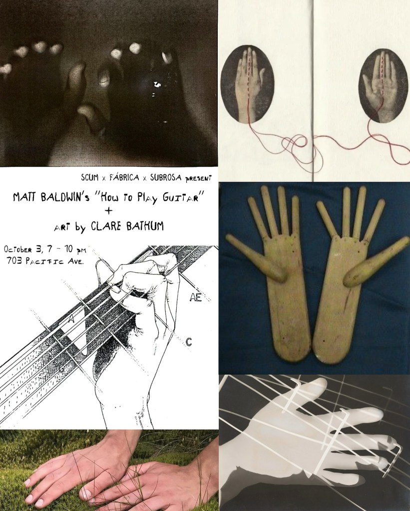 What are the correlations between bending over a stitch and bending a guitar string? Come find out at our SubRosa x Fabrica x SCUM First Friday event, October 3 from 6 – 9 pm. clare bathum’s fiber works and digital collages will be on display, along with a special reading and performance from Matt Baldwin, on tour from Los Angeles with his new book/collected zines “How to Play Guitar”. DJ leshy and friends will be spinning tunes throughout the evening. Read more about the artists below.