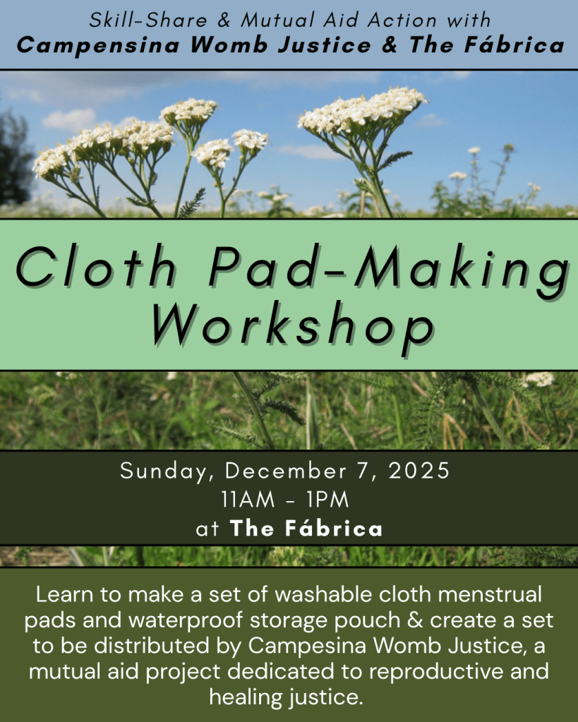 Learn to make a set of washable cloth menstrual pads and waterproof storage pouch. Optionally, you can also create a set of pads for distribution by Campesina Womb Justice, a mutual aid project dedicated to reproductive and healing justice. You can find Campesina Womb Justice on social media @campensinawombjustice and Link Tree.