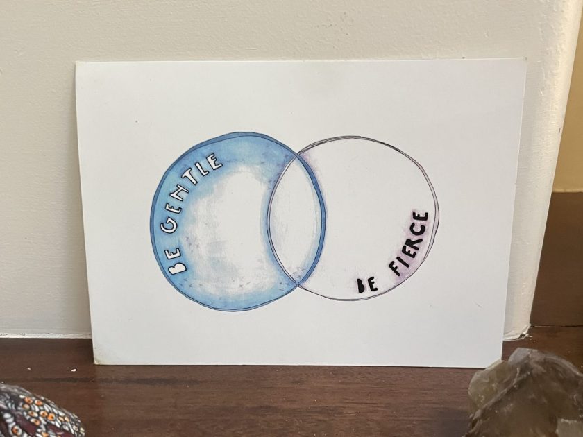 A photo of small art print: it shows a venn diagram on a white background. One circle shows the phrase “be gentle” on a blue watercolor wash. The other circle shows the phrase “be fierce” with a hit of rosy purple color.