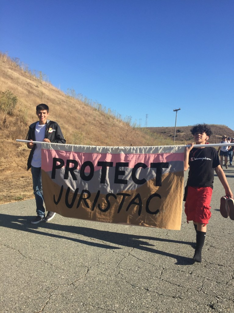 Two young people hold a “Protect Juristac” banner at a march in 2019. The Fábrica made and donated this banner to the movement to support their efforts.